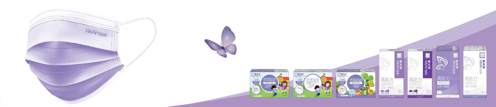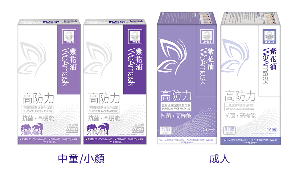 紫花油®WeArmask成人及中童/小顏口罩均採用高質素的熔噴布物料製造,達到醫療級別,分別符合ASTM F2100-2019 Level 3、ASTM F2100-2020 Level 3及EN14683:2019 Type IIR標準。